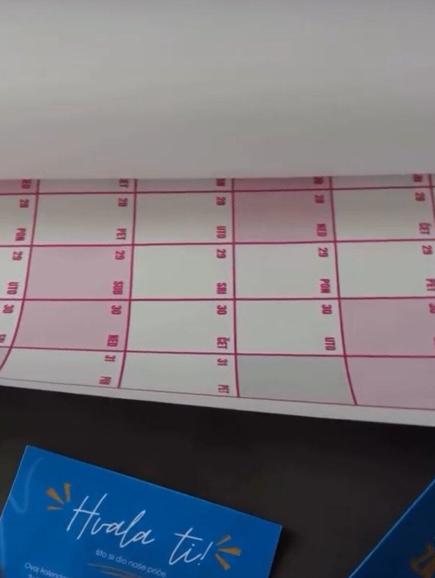Oduševljena sammn! Pratim vas na Instagramu i morala sam naručit! bdw puno je veći nego što sam očekivala 👀 baš se vidi da ste pazili na svaki detalj. Papir je isto super nije onaj obični tanki print papir. Ekipaa hvala vam za kalendar! 🥰