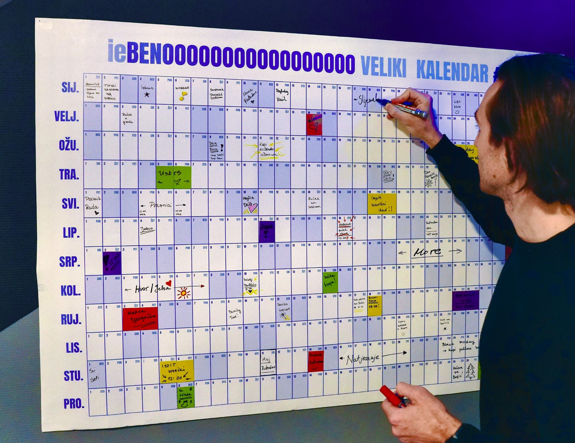 Inaće sam sama lijepila papire i crtala tablice po zidu jer nisam mogla naći normalan veliki kalendar. 😅 Vidi se na slici moja stara 'instalacija' desno i novi ieBENO lijevo. Napokon se neko sjetio napraviti to profesionalno, a ne kao moj likovni iz osnovne hah!