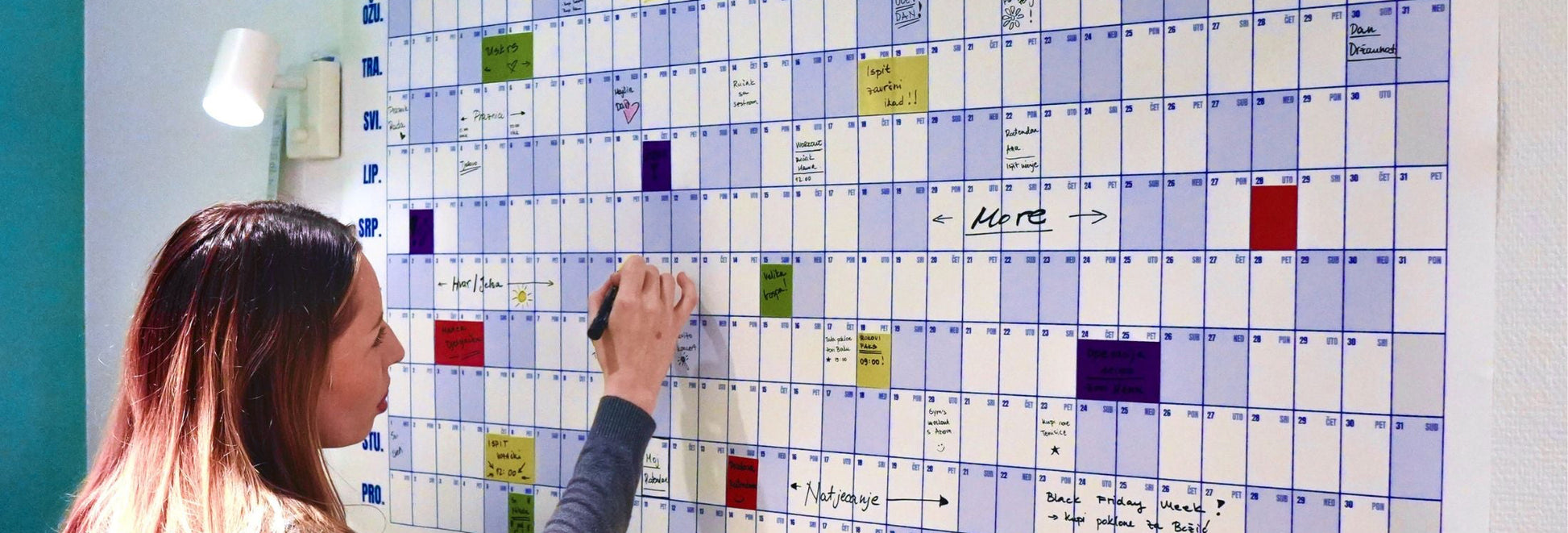 Po kalendaru možeš pisati olovkom, kemijskom ili tankim permanent markerom. Za naljepnice koristi tanki permanent marker. Gel olovke i flomasteri se ne preporučuju jer se razmazuju.